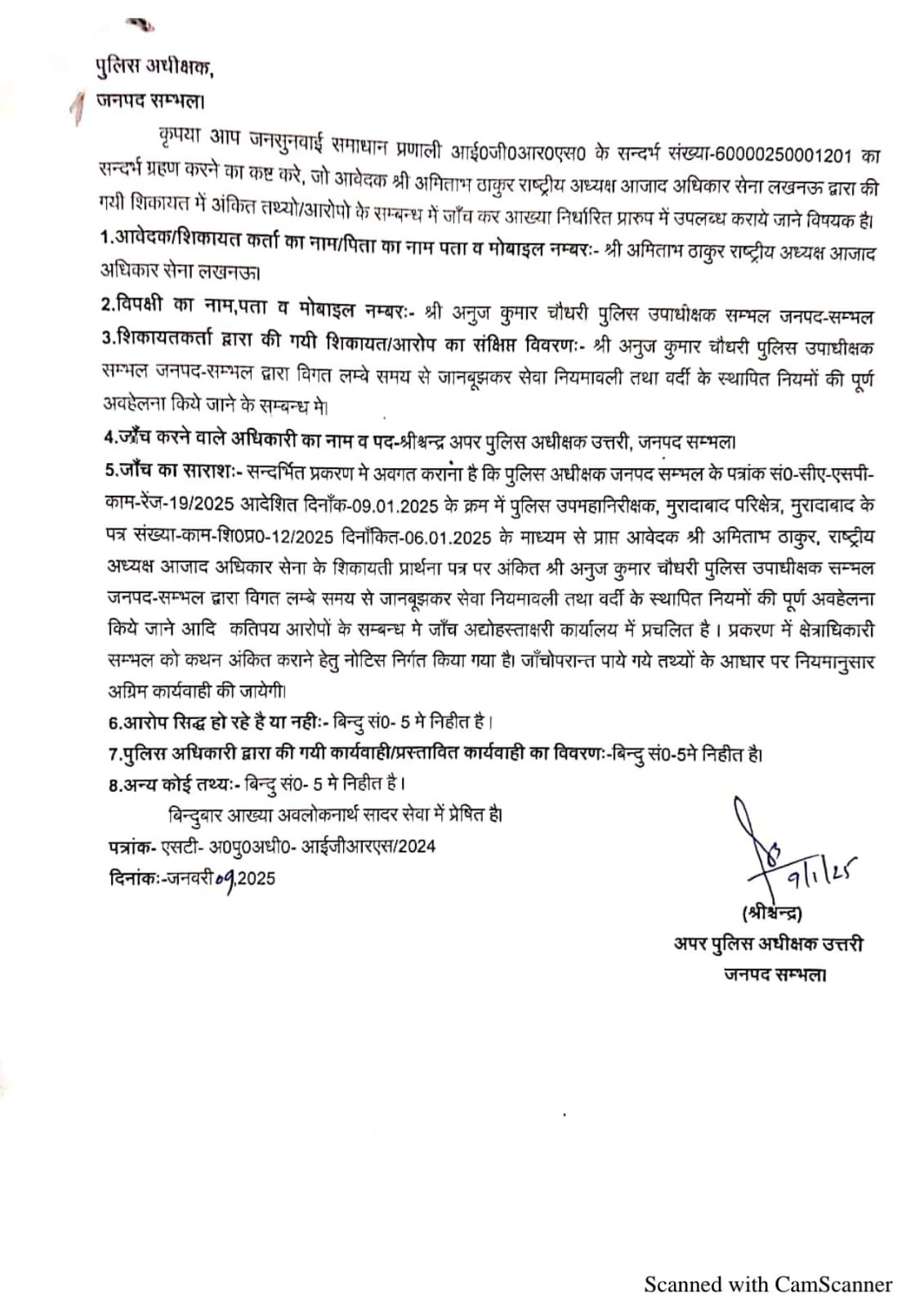 सीओ संभल अनुज चौधरी के खिलाफ आजाद अधिकार सेना के राष्ट्रीय अध्यक्ष अमिताभ ठाकुर द्वारा भेजी गई शिकायत की जांच शुरू हो गई है.अपनी शिकायत में अमिताभ ठाकुर ने कहा था कि अनुज चौधरी ड्यूटी के दौरान लगातार अपनी ड्यूटी से इतर विभिन्न धार्मिक कार्यक्रमों में भाग लेते दिख रहे हैं. इनमें धार्मिक जुलूस से संबंधित गदा उठाने और उसे पुजारी को देने, ड्यूटी के दौरान भजन गाने, विभिन्न मंदिरों में धार्मिक कार्यक्रमों में भाग लेने के कार्य शामिल है.